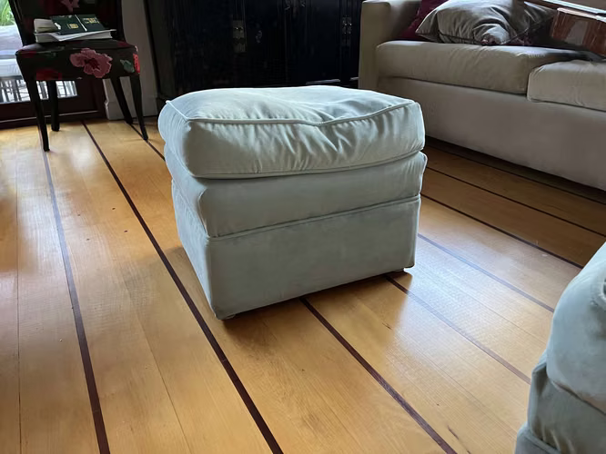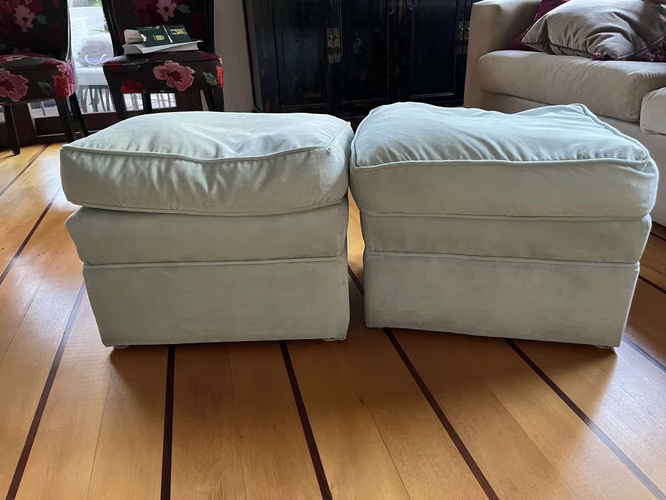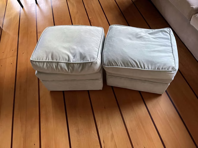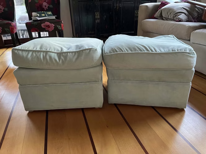 Dos poltronas en exelente estado con fundas con cierre de lino beige 70000 cada una.,Pouf también en exelente estado tapizados en terciopelo celeste y con fundas de lino con cierre beige , 55000 cada una. Exelente oportunidad