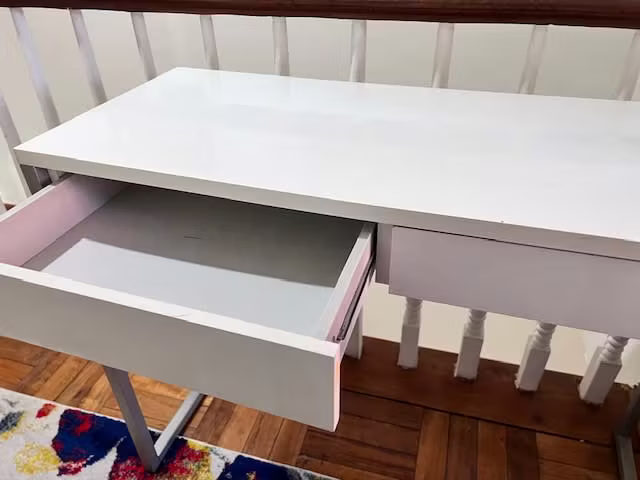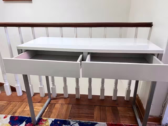 Escritorio blanco, 2 cajones, patas de aluminio.
