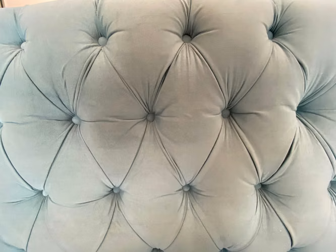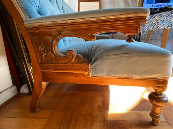 Hermoso sillón antiguo, con capitoné en el respaldo, tapiz seminuevo, celeste pastel.