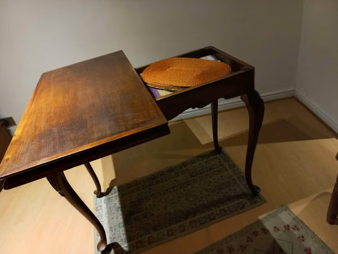 Mesa de juego impecable, con posibilidad de usar también como comedor, al abrirse y girar. La mitad de la superficie tiene espacio para guardar. Medidas 97X97 y 79 de alto