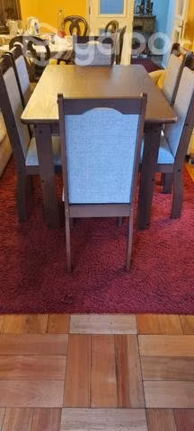 Juego comedor 6 personas de madera y sillas madera con género. Largo 1.50 Mts., Ancho 30 Cms,