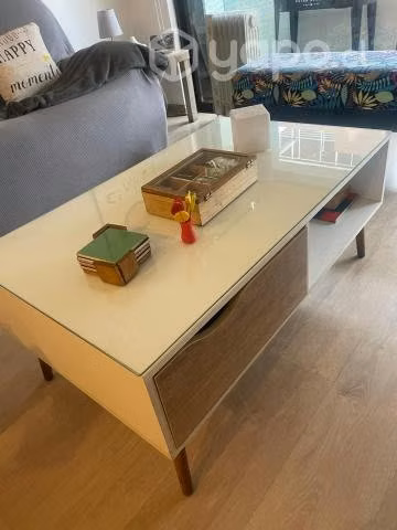 Se vende cómoda mesa de centro, con cajón, y cristal a medida para mayor protección.