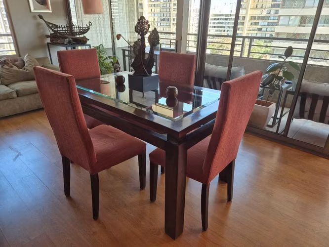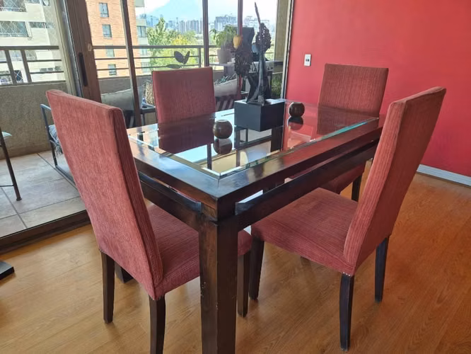 Excelente mesa de comedor, madera sólida con vidrio biselado. 4 sillas impecables de felpa Sin manchas...