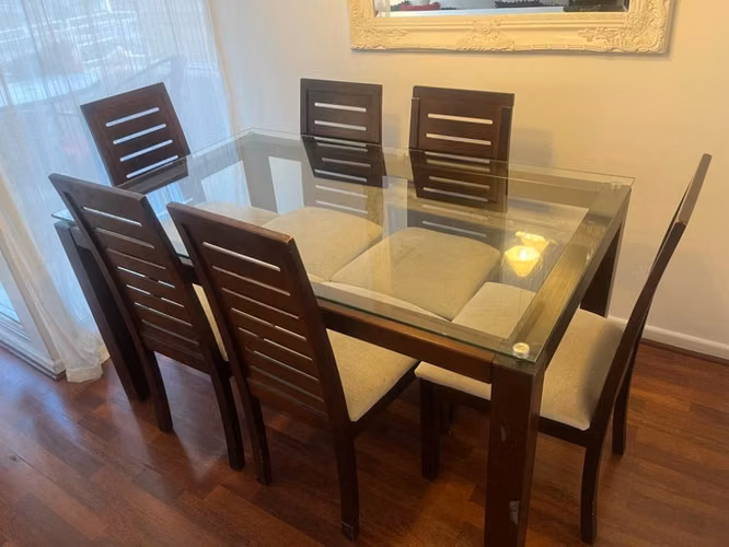 Base de madera color café , 6 sillas de madera mismo color patas y respaldo , tapizados hace poco. Con uso y e vende tal como está.