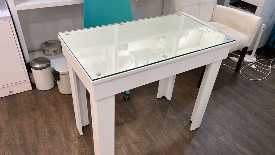 6 MESAS DE MANICURE EN MADERA COLOR BLANCA CON VIDRIO, 90X50X77, tenemos un salón completo a la venta, sillas, poltronas, recepción, productos, entre en contacto.