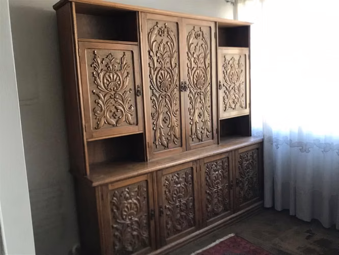 Mueble grande, antiguo, lleno de detalles tallados.