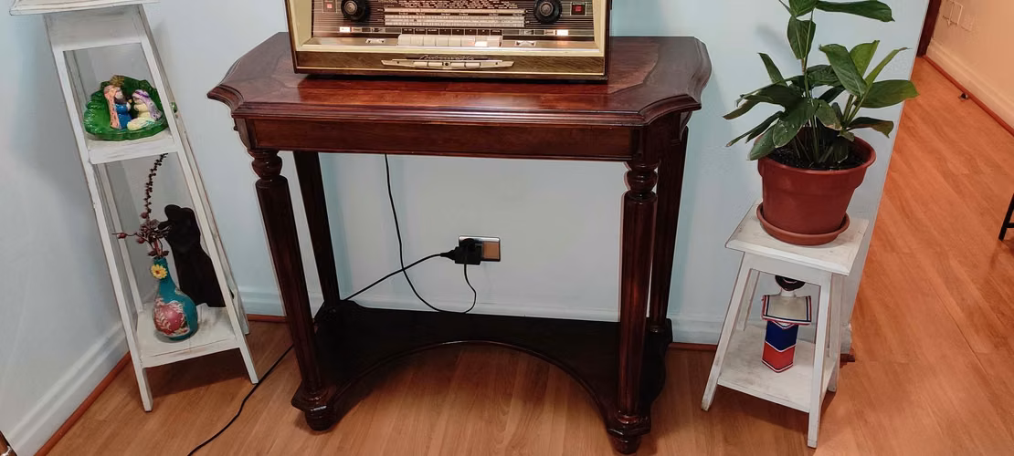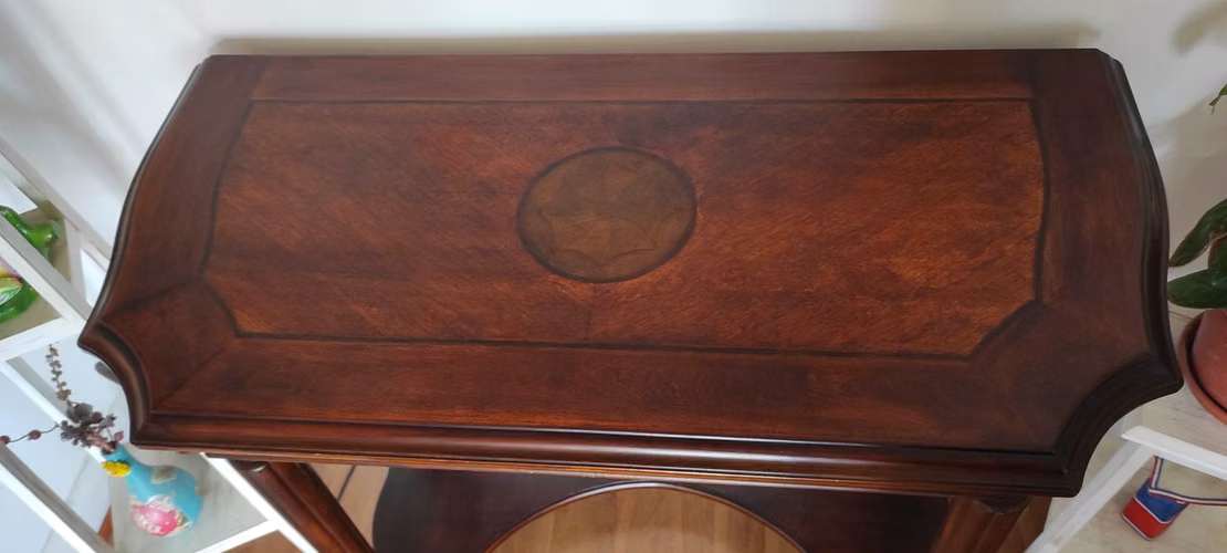 Mueble tipo arrimo modelo Ashley, de gran clase y calidad. Cuenta con dos niveles de cubierta, la principal muy amplia y una basal a nivel de piso, con patas tipo columnas, 100% madera.