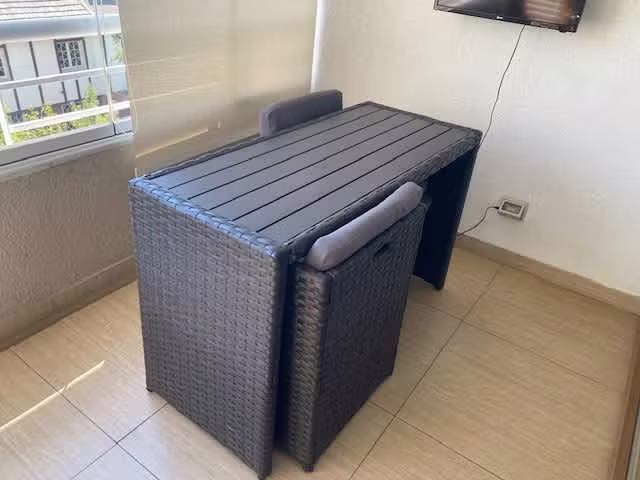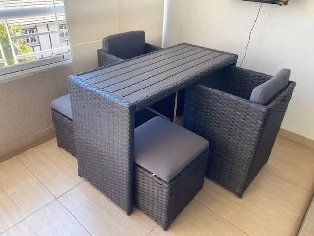 Comedor de terraza compuesto por mesa rectangular, dos sillones y dos pisos, todos con cojines en tono gris. Se pueden ensamblar para ahorrar espacio.