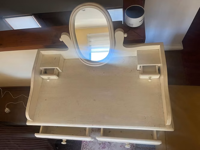 Mueble tocador, con cajonera, espejo y banca, madera patinada, muebleria El Rehue