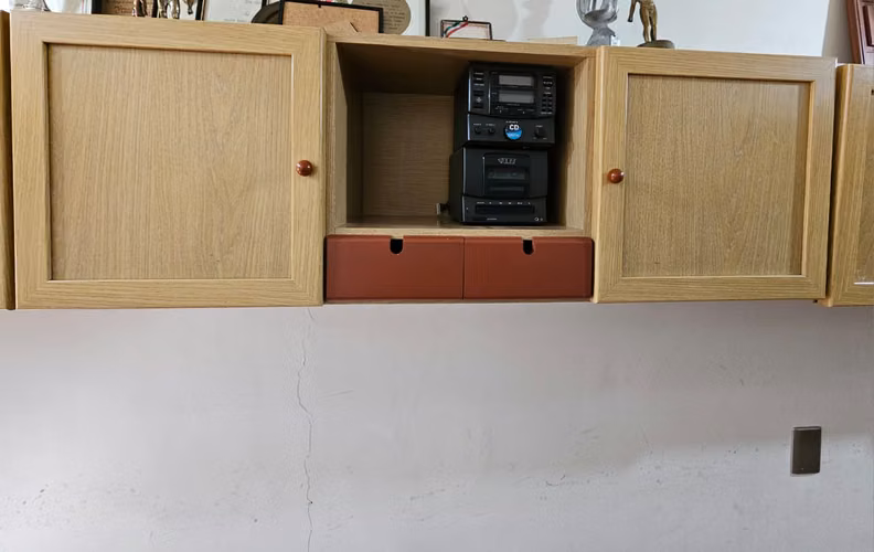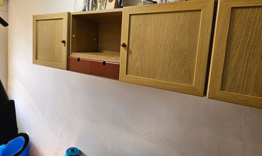 Mueble mural (español), con puerta, cajoncitos y repisa, medidas ancho 120cm, alto 40 cm, profundidad 40 cm. Masisa enchapado en melamina, color beige claro y cajón terracota. En buen estado.