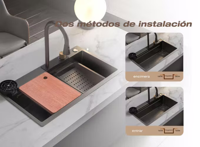 Diseño Empotrado y Bajo Fregadero: Este fregadero de cocina con cascada se puede instalar como empotrado o bajo fregadero de acuerdo a su tipo de encimera, ya que es perfecto para ambos. El fregadero también viene con un dispensador de jabón para facilitar la limpieza y un lavavasos con una fuerte presión de agua para limpiar las tazas en cuestión de segundos.