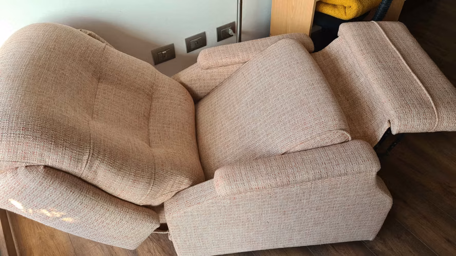 Lindo y cómodo Bergere reclinable recién retapizado, en buen estado que solo requiere mantención al mecanismo del apoyo de las piernas. Ancho 70 cm, largo 100 cm, largo en posición reclinada 140 cm