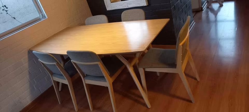 La superficie de la mesa tiene marcas de uso y puede ser fácilmente renovada con lija y barniz. Sillas requieren limpieza de tapiz, precio poco conversable.