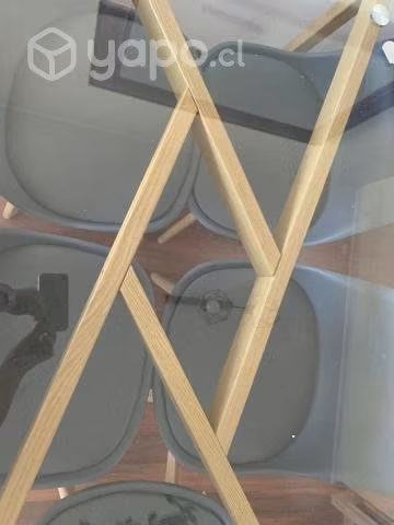 Comedor vidrio, patas de metal simulan madera, con 6 sillas