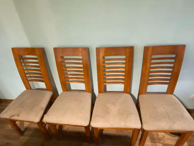 Sillas: Tapizadas en color crema, aunque algunas requieren retapizado por desgaste.