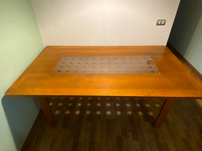 Mesa usada: Presenta algunos detalles estéticos por el uso, como rayaduras visibles en la superficie de la madera raulí (ver fotos).