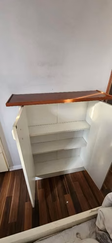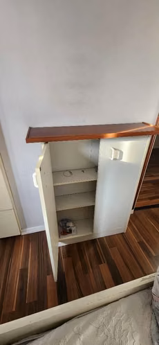 Mueble organizador color blanco com bordes cafés, 3 divisiones, puertas en buen estado. 78 cm largo 94 cm alto 24 cm ancho