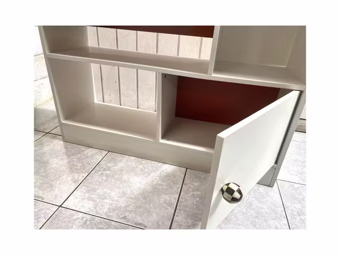Librero blanco usado en buen estado. 10 compartimentos y un cajón con puerta. Medidas 1.60 alto x 80 de ancho x 25 de profundidad.