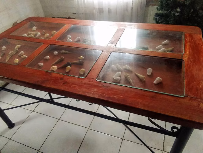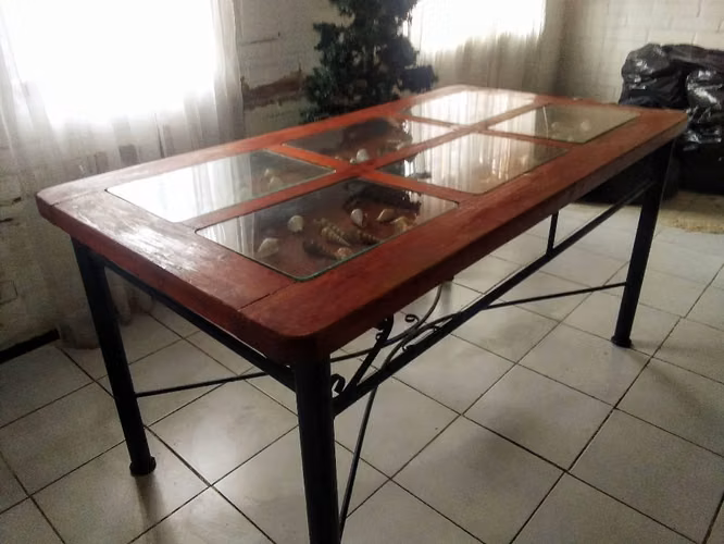 vendo mesa comedor de madera y fierro, con compartimientos para decoración.