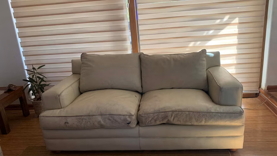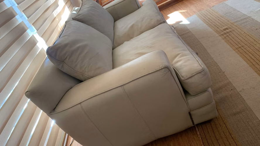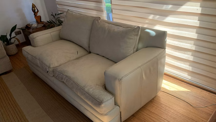 Sofá de cuero 3 cuerpos en muy buenas condiciones Color Crema cuerina largo: 2,30 mts Profundidad: 95 No incluye flete