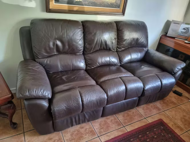 Sofá Rosen de cuero de tres cuerpos, en ambos costados estilo bergere. Con sus mecanismos en excelente estado.