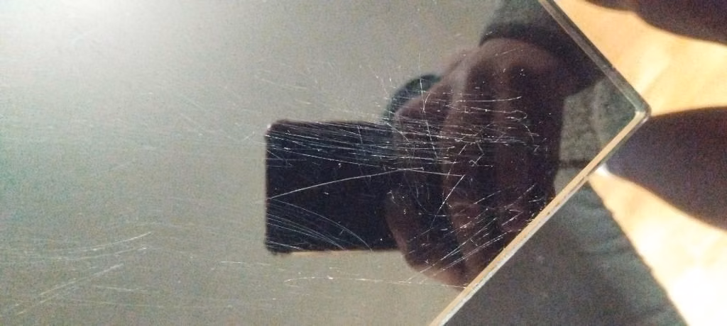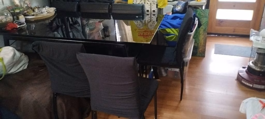 comedor con mesa de vidrio más seis sillas con fundas tiene un detalle en la mesa que es mínimo en una esquina solamente.