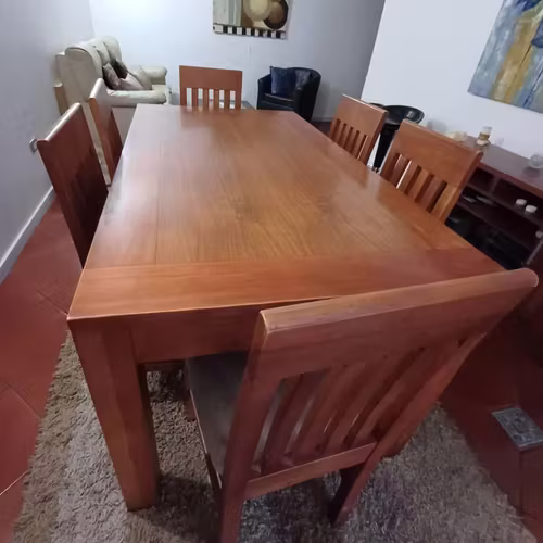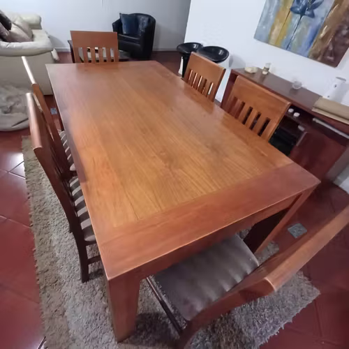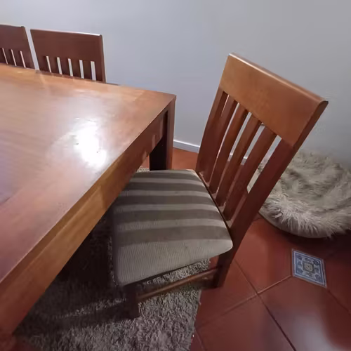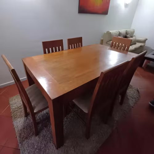 Comedor de madera firme en sus patas y estructura. Está usada pero muy bien mantenida. Cuenta con sus 6 sillas, tambien en buen estado, solo hay que renovar la tapicería.