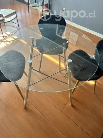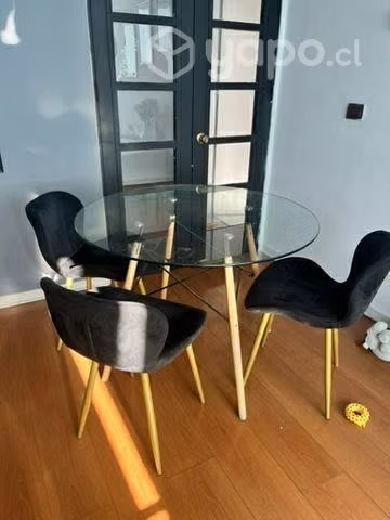 Vendo comedor de vidrio grueso. Tiene 3 sillas de terciopelo negro en perfecto estado; unico detalle las patas de la mesa que mi perro rasco pero se pueden lijar. El vidrio esta en perfecto estado sin trizadura o rayas.