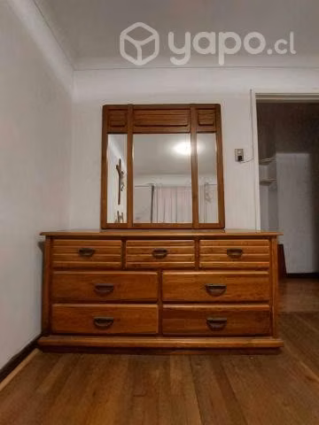 Cama Box Spring con ruedas, dos veladores, una cómoda con espejo. Colchón en excelente estado. Madera color café. Importado U.S.A.