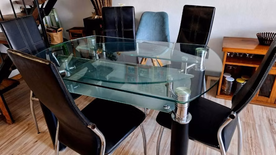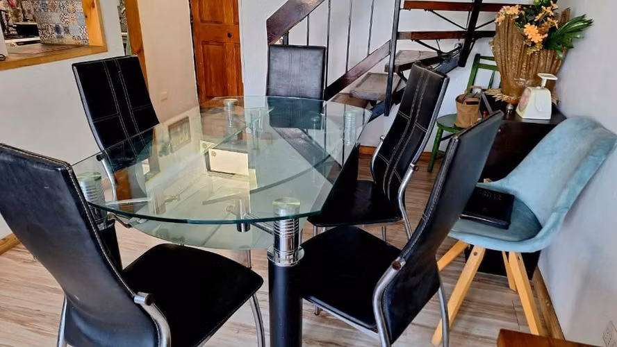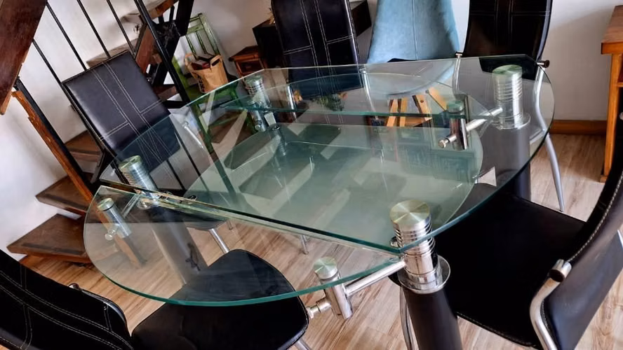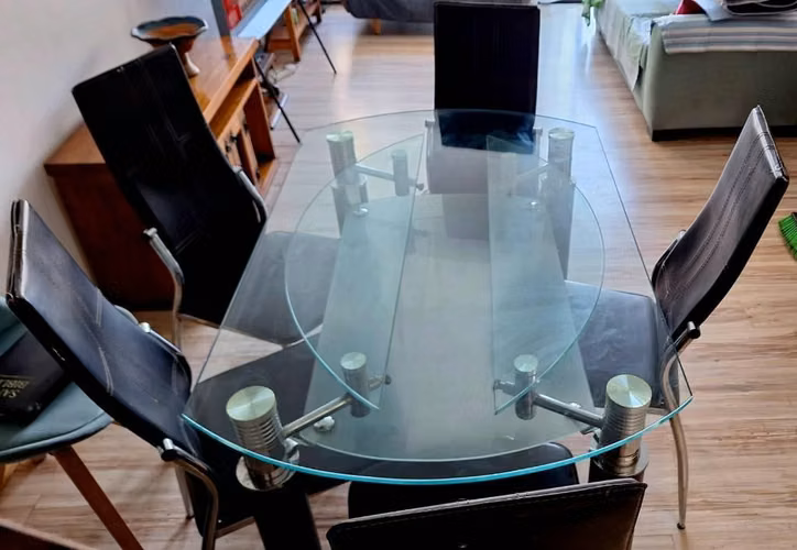 Vendo lindo comedor de vidrio, modificable de rectangular a redondo. muy firme y con cinco sillas. ancho 0.82 mts, largo 1.33 mts y extendido 1,33 mts de diámetro circunferencia. 0.77 mts altura. Precio conversable, interesados contactarme vía wapp. Juan Pablo.