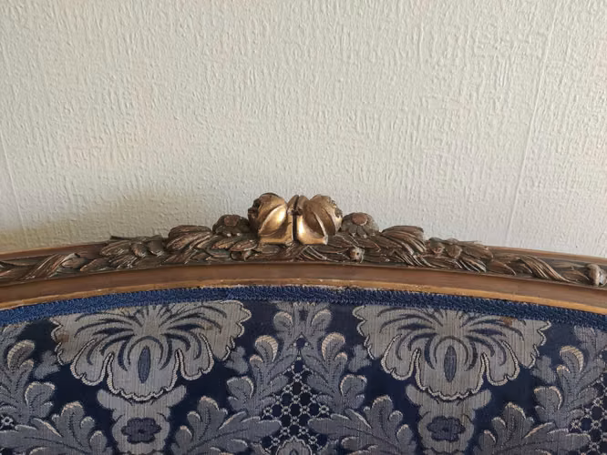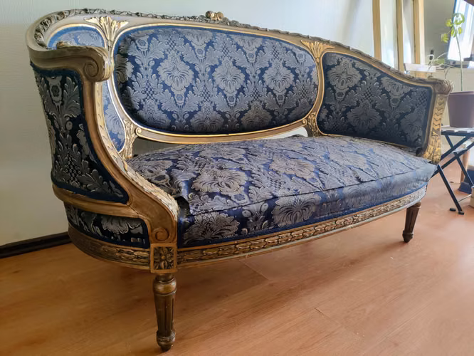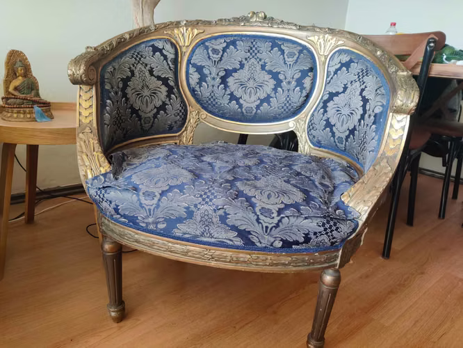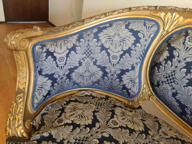 - ColinaSillón loveseat clásico con tapizado mixto y detalles en madera tallada