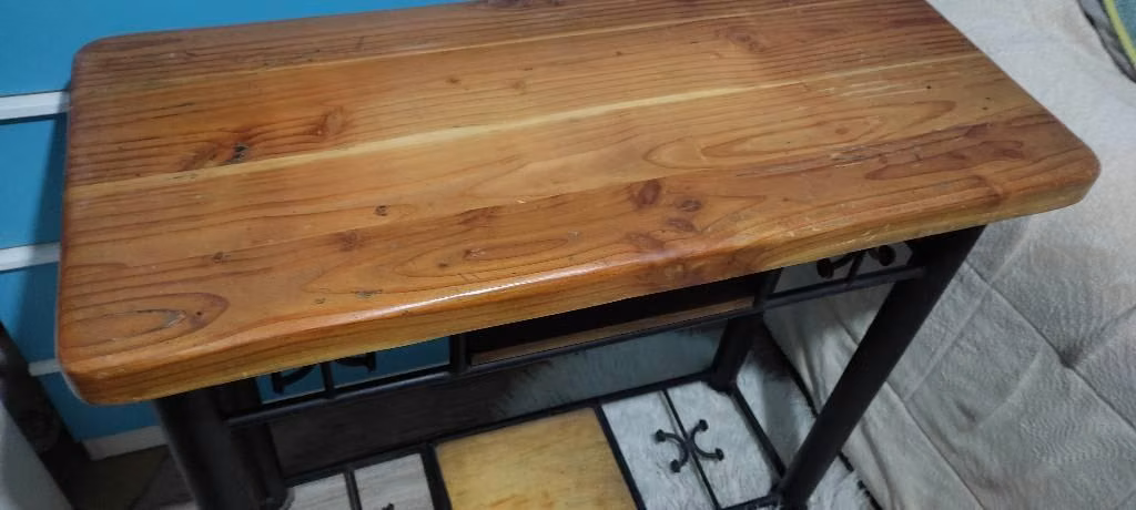 Bello arrimo en madera gruesa y fierro. Medidas: 70 cm de ancho, 30 cm de profundidad y 55 cm de alto