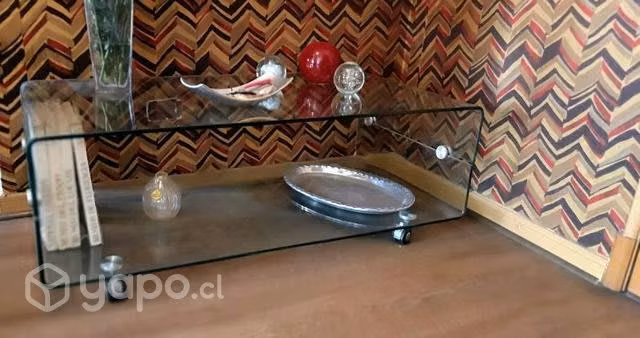 Mesa de centro rectangular de vidrio curvo y con ruedas.117 x59 x 43.detalle menor