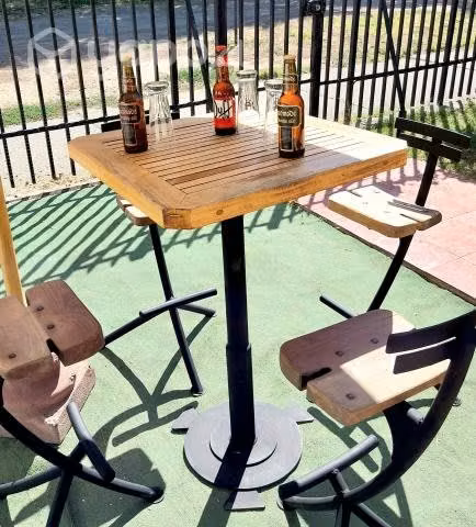 Set para bar, terraza, jardín, etc, incluye : mesa alta con base de fierro y cubierta de madera de teca de 67 x 67 x 1,00 mts de alto, 4 taburetes exclusivos de perfil tubular redondo de 3 cms de diámetro y respaldo de platinas de 5mm de espesor, asientos apernados de madera de nogal, miden 37 frente, 68 – 91 alto y 50 de fondo, acabado tonalidad negro mate. Está en buen estado, con señas de uso, tal como se aprecia en las imágenes. Su valor es de $ 350.000.- Se retira en Ñuñoa, , reserva de artículos (abono del 50%), despachos y envíos (Starken por pagar) previa transferencia bancaria y envío de datos