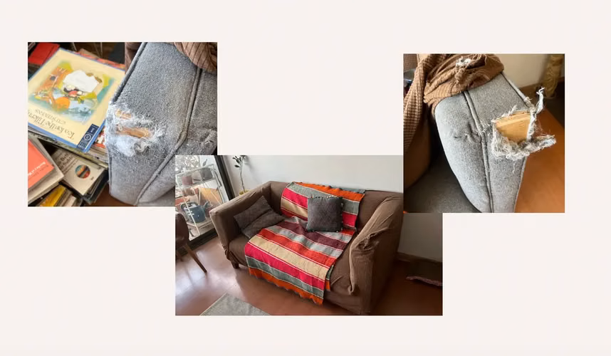 Sofá gris de dos cuerpos usado con detalles en los brazos por el uso. Se entrega con funda desmontable y lavable café (Referencia en fotos).