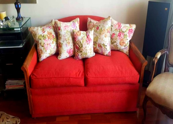 Vendo Sofá-Cama dos plazas hermoso, dos cuerpos, en perfecto estado, brazos de madera natural Raulí, tapizado en brocato en buenas condiciones, 2 cojines grande, 4 medianos y uno pequeño, relleno de plumas y esponja lo que lo hace muy muy cómodo.