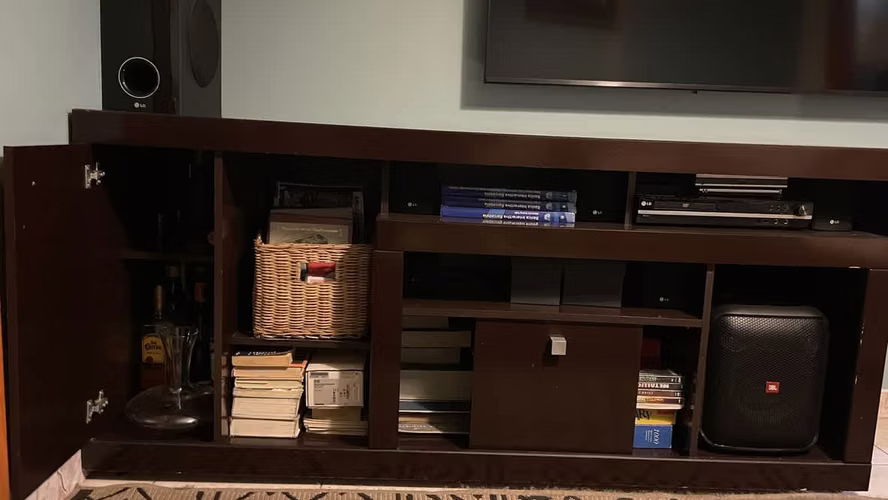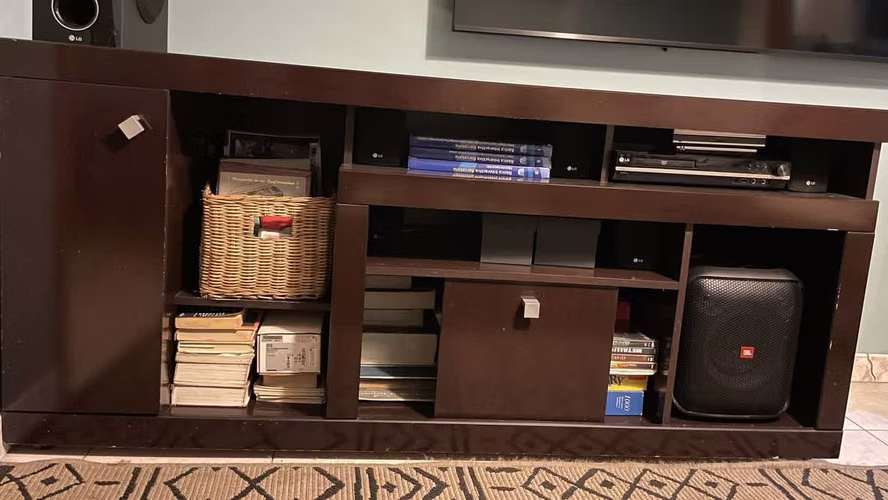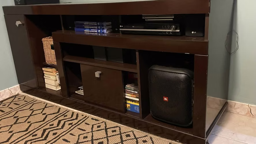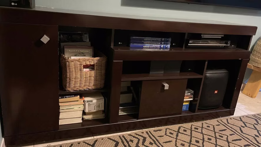 Vendo mueble de color caoba ideal para organizar todos tus equipos y mas, tiene espacio para tu televisor compartimientos para equipos de vídeos, parlantes y librería, ademas incluye un cajón largo que puedes usar para minibar perfecto para tus reuniones.