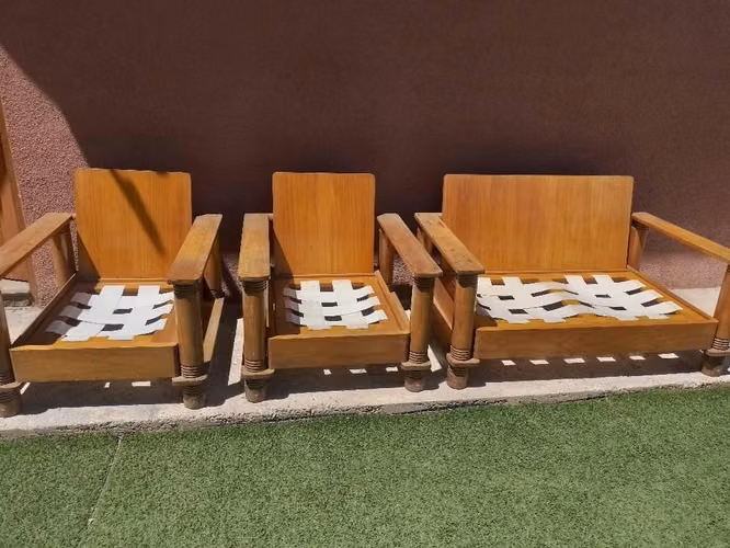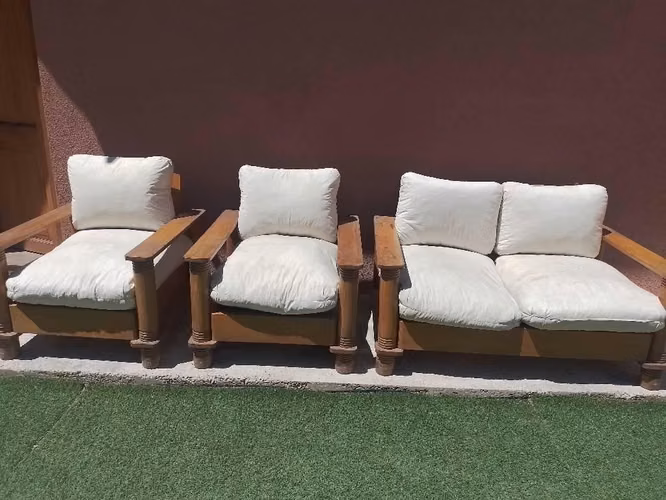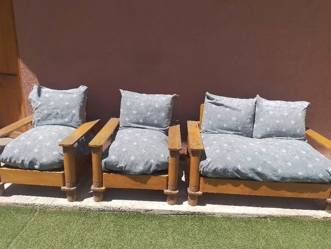 Juego en buen estado, para restauración de lacado y cojines ya que se mojaron parcialmente por lluvia. Tiene un par de detalles para reparar.
