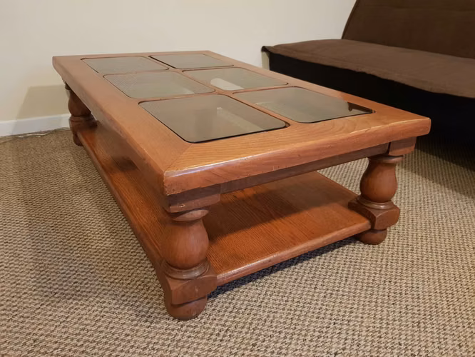 Bella mesa de centro hecha completamente con madera de encina maciza. Desconozco con exactitud su peso, pero a pulso se nota bastante pesada. Tiene medidas de (Largo) 118 x (Ancho) 69 x (Alto) 37 cm. Se encuentra en buenas condiciones, sin embargo, como detalle, posee algunas manchas en la cubierta por desgaste del barniz.