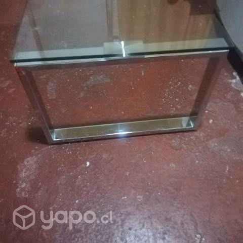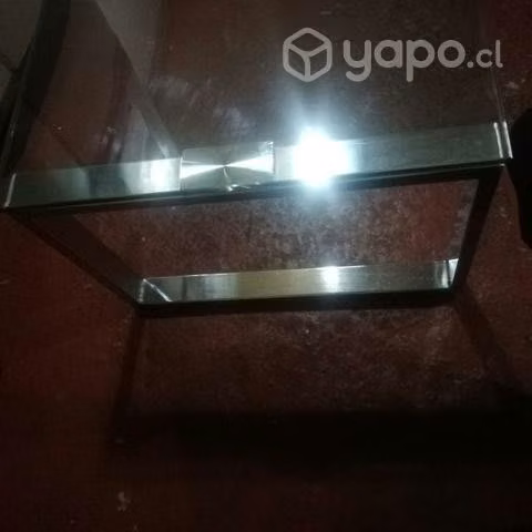 Mesa de centro con cubierta de vidrio grueso y apoyos de acero inoxidable, excelente estado.