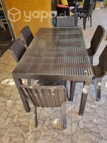 Mesa de terraza modelo Tavarua con vidrio, medidas 1,45x0.85, va con 8 sillas y 6 pisos y se regala mesa de apoyo blanca
