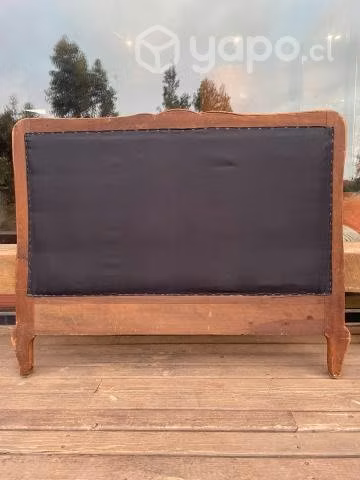 Hermosa cama de plaza y media, estilo normando, con resplados tapizados en color turqueza. Uno de los respaldos tiene dos botones partidos. La cama es de madera macisa.