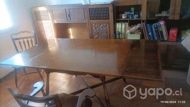 Comedor de madera fina, 4 sillas sin apoya brazos y 2 sillas con apoya brazos. Mesa ancho 1m, largo de 1,20 m extensible a 1,55m o a 1,90 m. Tapicería de cuero. Excelente estado.