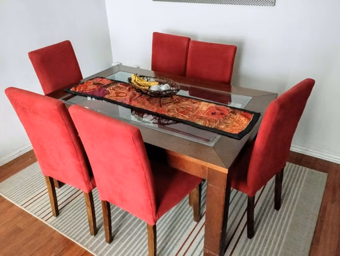 Mesa de comedor de 100 x 150, de madera con vidrio de 70 x 120 en la cubierta, con 6 sillas de tela.