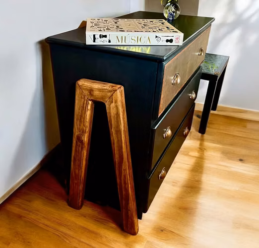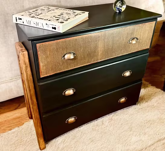 Hermosa cómoda renovada, con patas en forma de A, hechas a mano para darle un toque moderno y elegante. El acabado es en color negro con patas teñidas en un elegante tono nogal oscuro, y las manijas de cobre antiguas complementan el diseño. Ideal para cualquier habitación. Disponible para retiro en Providencia, con opción de entrega por una tarifa adicional. No te pierdas esta oportunidad de llevarte a casa una pieza única. ¡Contáctame para más detalles o para venir a verla en persona!