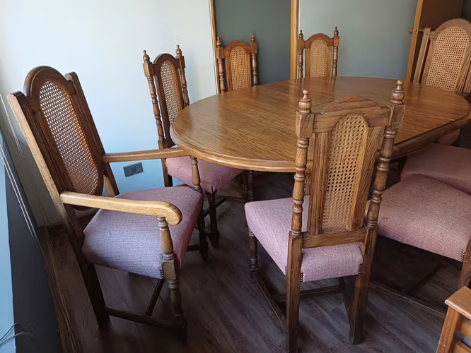 - Mesa de comedor redondo de madera de encina.