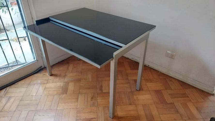 Mesa de Metal y vidrio extensible. Medidas 110 x 55,5 (sin extender) y 110 x 111 (extendida) con 77 alto. Las sillas tienen medidas 43x43 y 45 de alto.