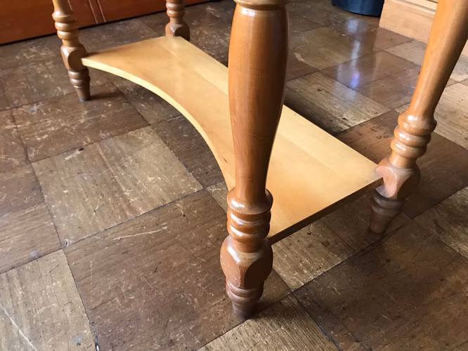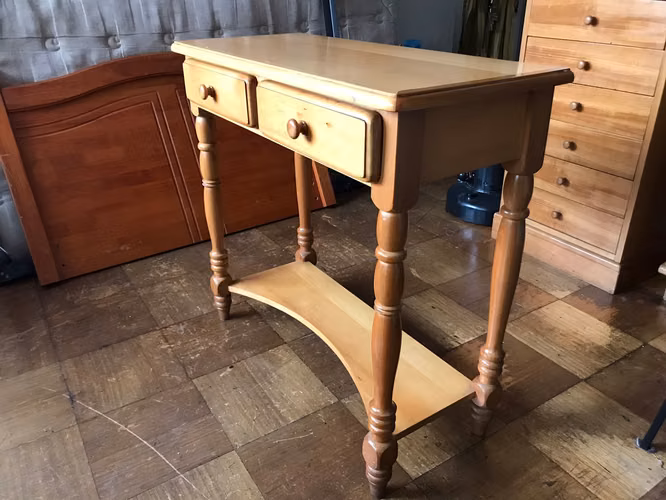 Mesa de arrimo, recibidor de madera Muebles Sur, dos plataformas y dos cajones.