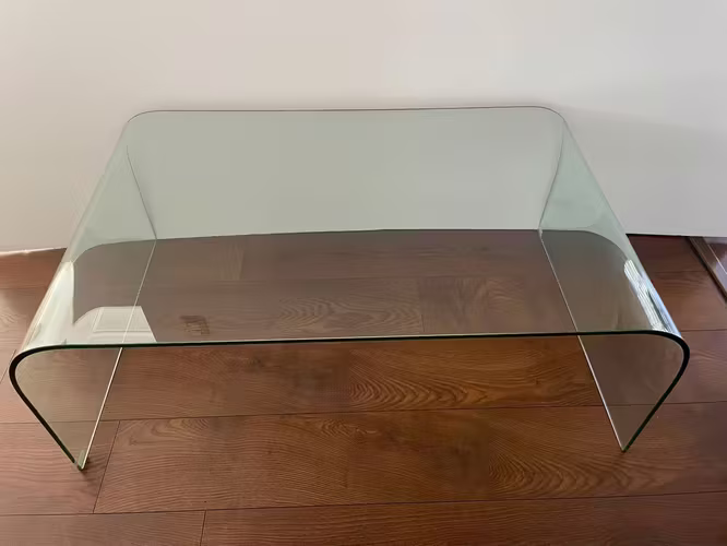 Impecable mesa de centro de vidrio templado con vértices curvos. Diseño moderno y elegante. Medidas 40 cm de Alto, 110 cm de Ancho, 66 cm de Fondo.