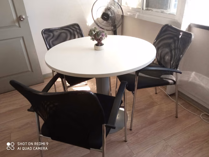 Se vende mesa redonda blanca de madera con soporte de metal gris. Medidas: 90 cm de diametro x 90 cm de alto. 3 sillas de metal cromado con tela elasticada negra, gran comodidad. Se encuentran en perfecto estado.